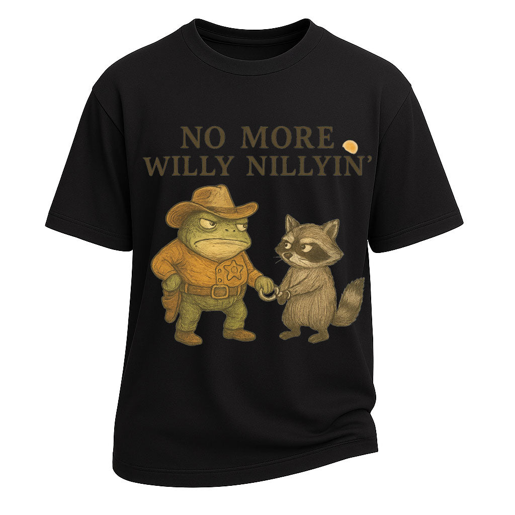 Preço Regular $26.99 USDBring humor and western charm together with the LouMark "No More Willy Nillyin’" t-shirt. Featuring a playful cartoon-style frog cowboy and raccoon handshake graphic, this tee delivers both fun and attitude in one bold design. Crafted from 260G heavy-weight 100% cotton, it offers durability, comfort, and an oversized fit that fits perfectly into casual streetwear or western-inspired fashion.