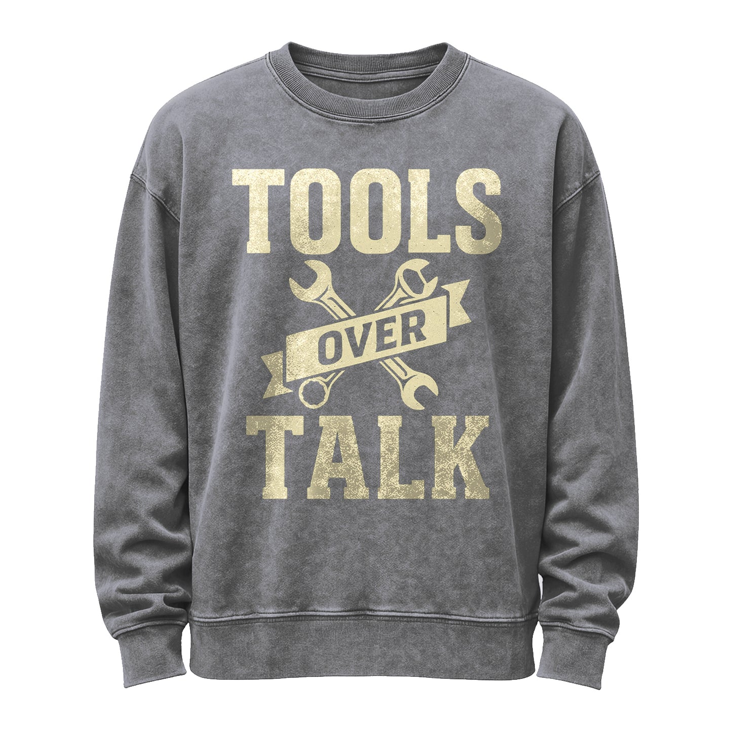 This vintage washed-black crewneck features bold distressed bone/ivory typography reading “TOOLS / TALK,” centered over crossed wrench icons with a banner that reads “OVER.”