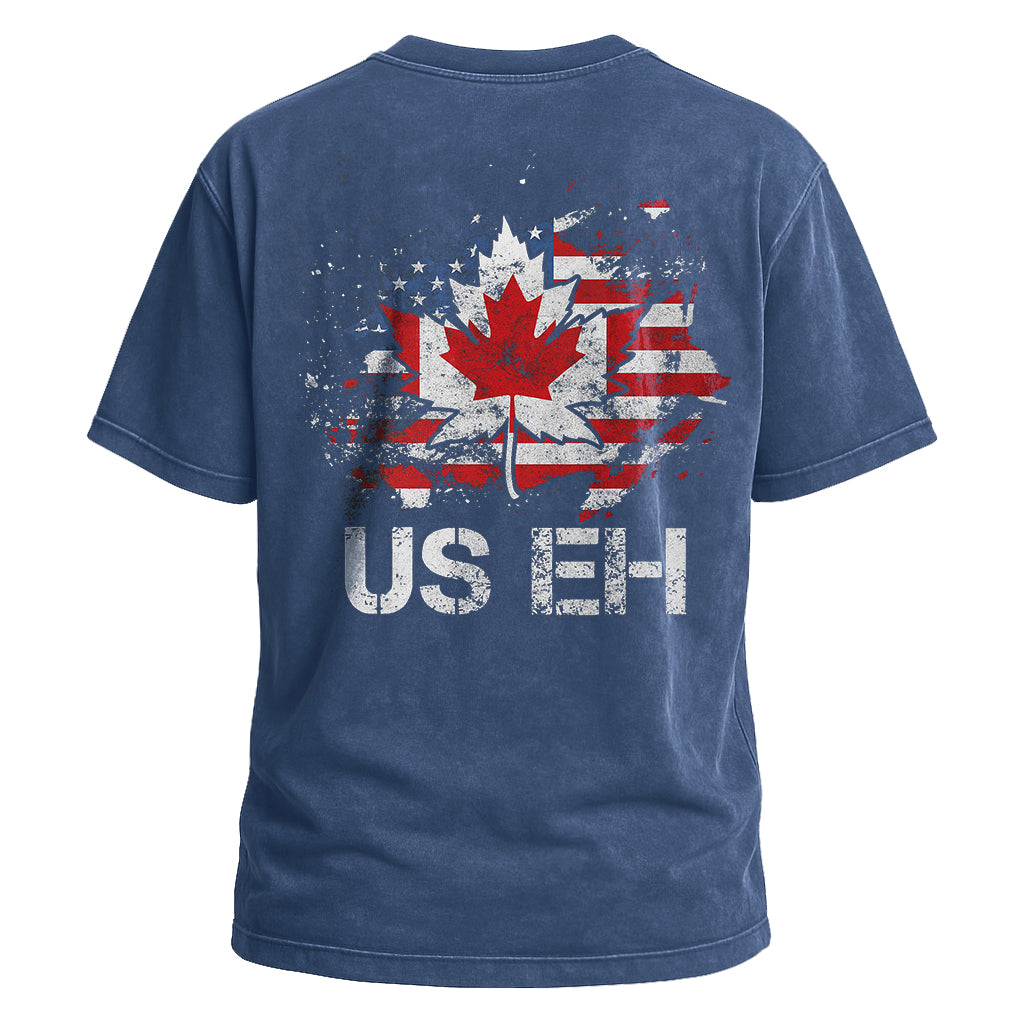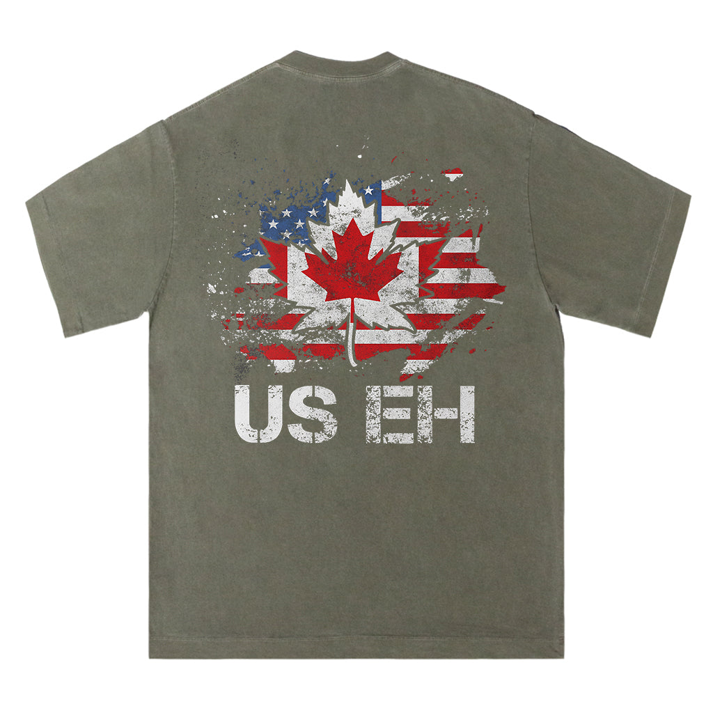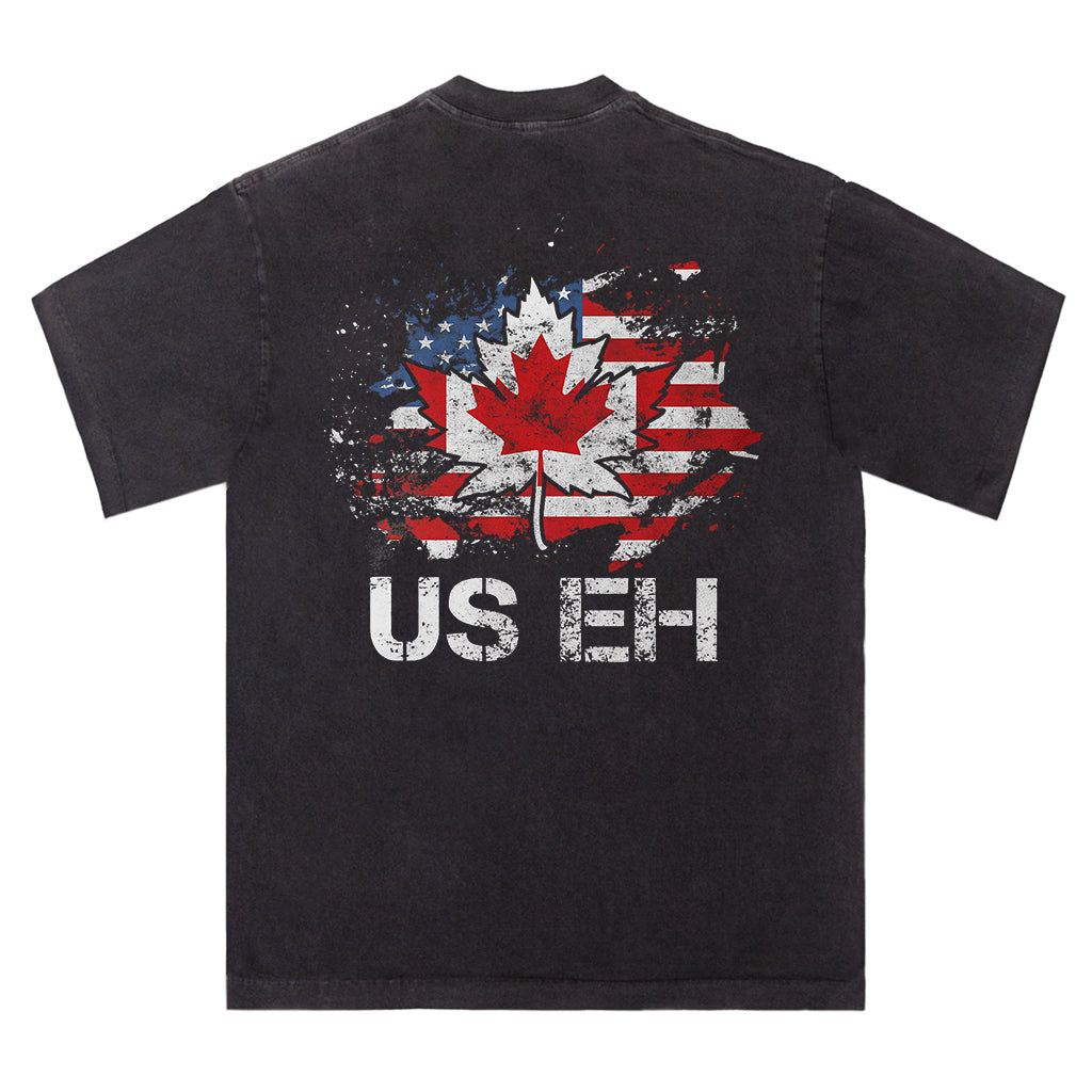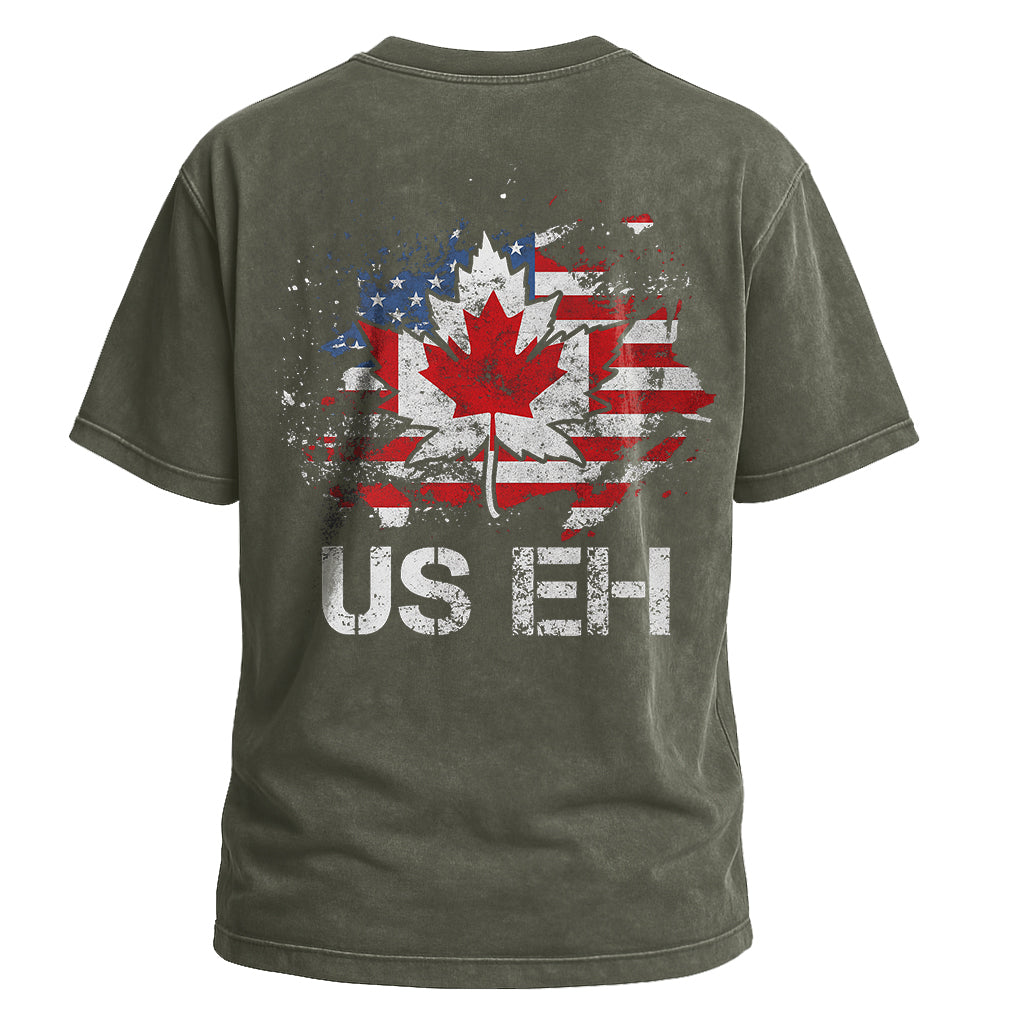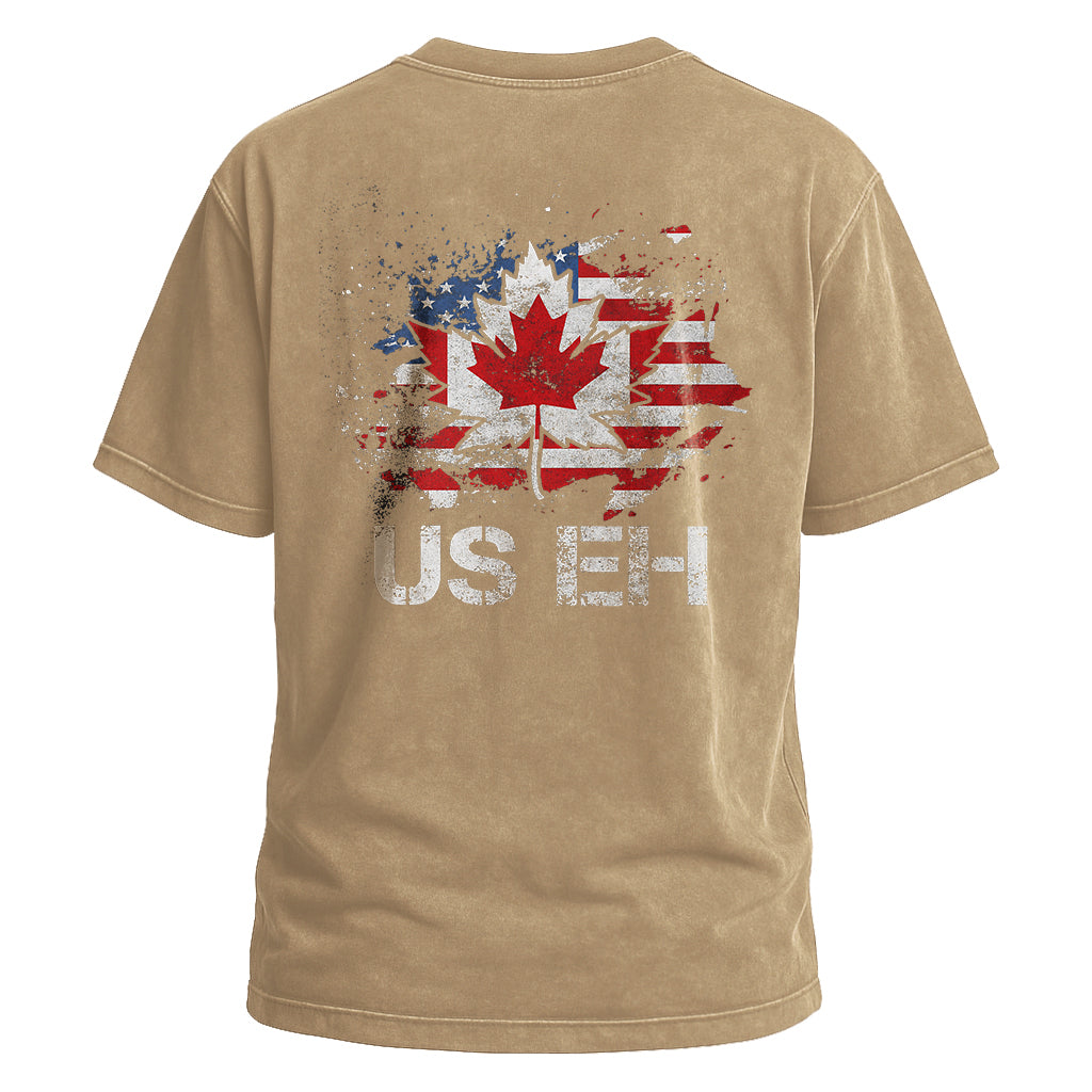 Preço Regular $26.99 USDCelebrate North American friendship with LouMark’s US EH Maple Leaf Tee. This washed brown shirt features a distressed graphic combining the American and Canadian flags with a prominent red maple leaf, accompanied by the text “US EH.” Made from 100% cotton for comfortable wear with a vintage, rugged look.