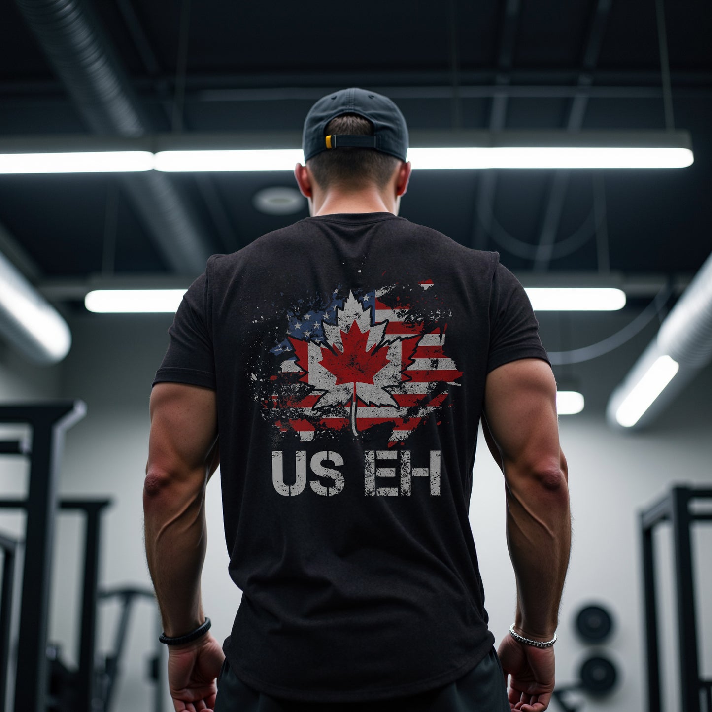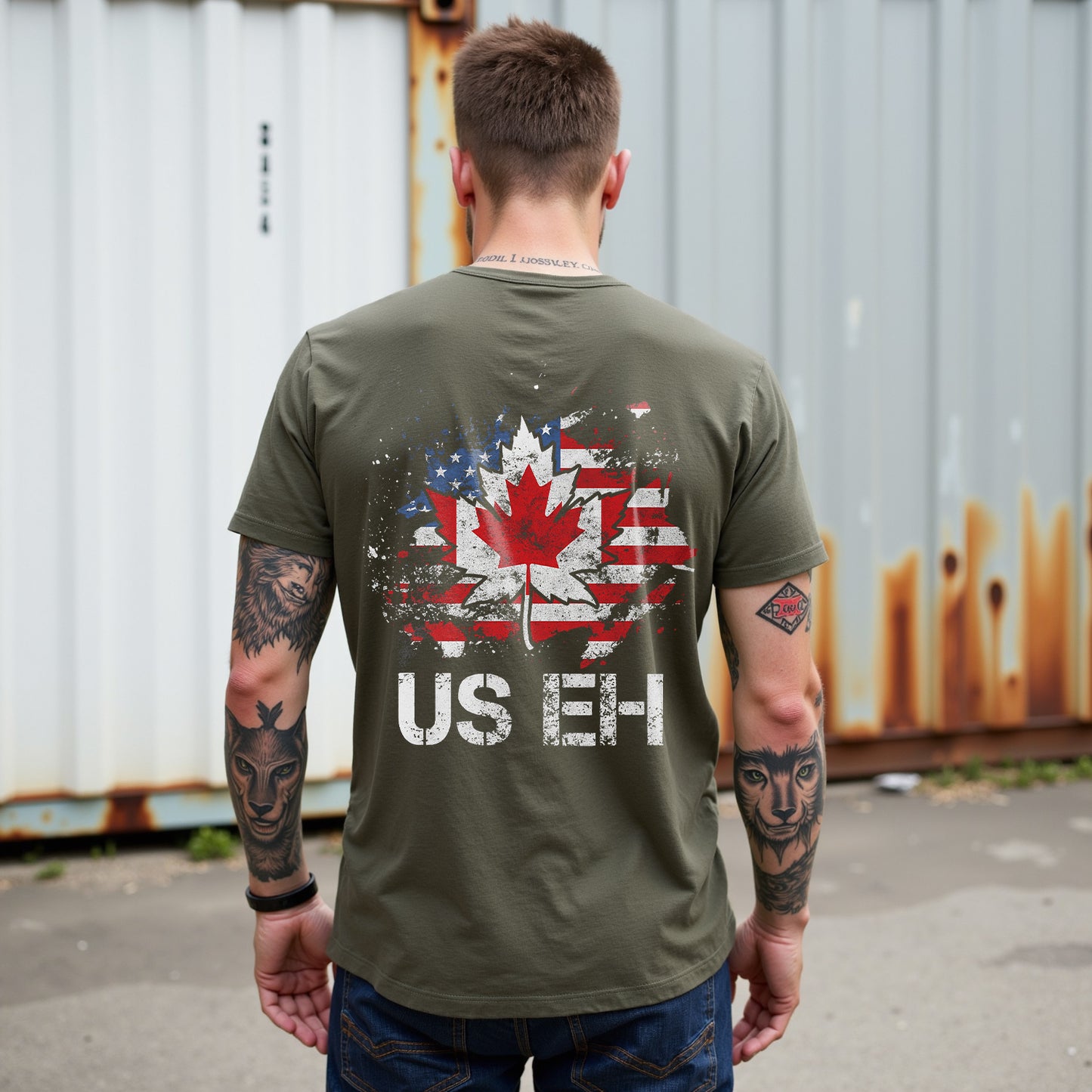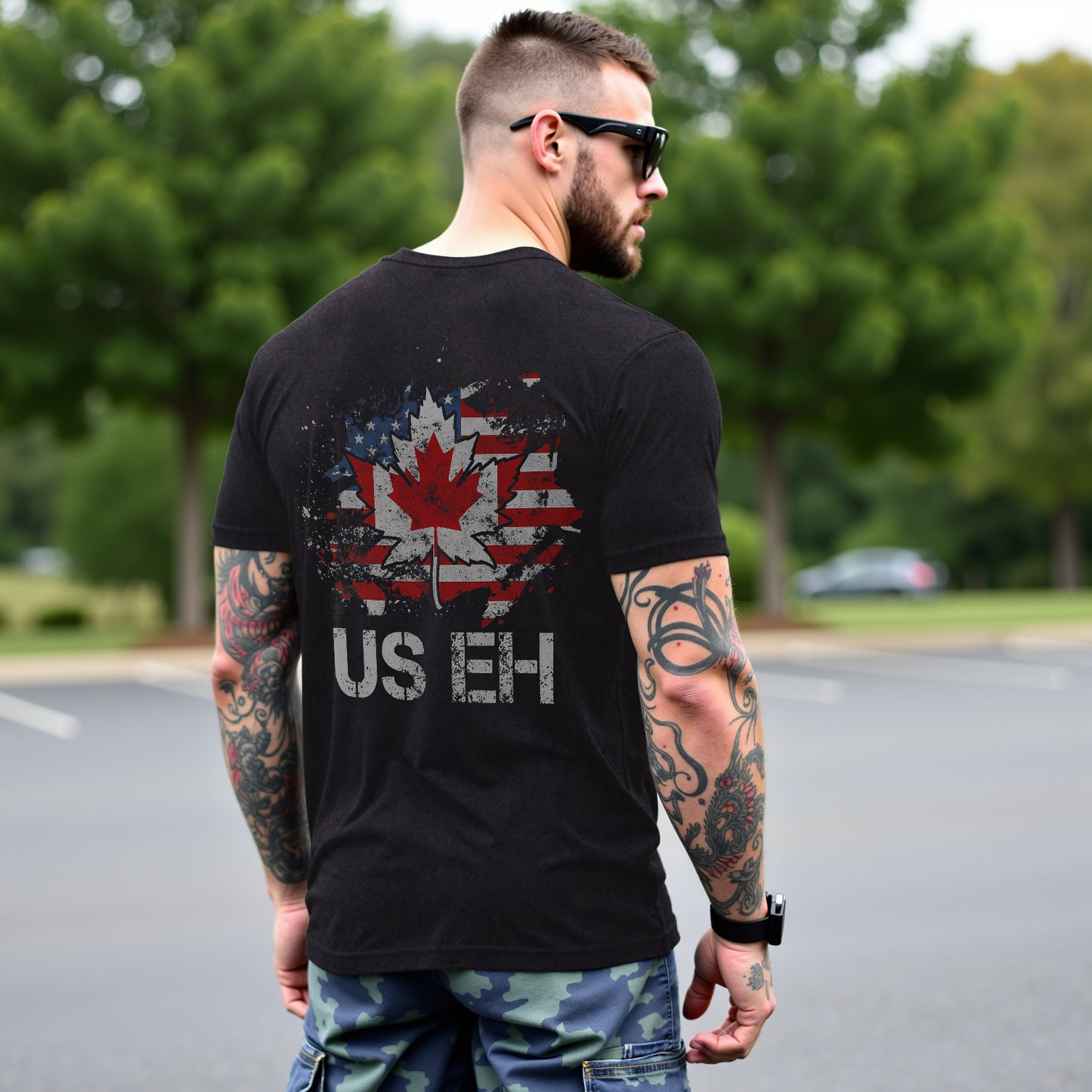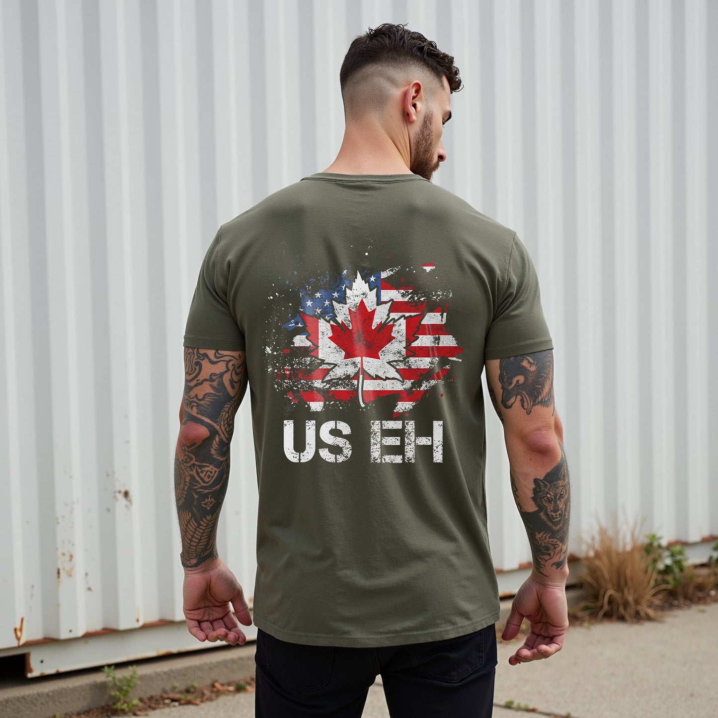 Preço Regular $26.99 USDCelebrate North American friendship with LouMark’s US EH Maple Leaf Tee. This washed brown shirt features a distressed graphic combining the American and Canadian flags with a prominent red maple leaf, accompanied by the text “US EH.” Made from 100% cotton for comfortable wear with a vintage, rugged look.